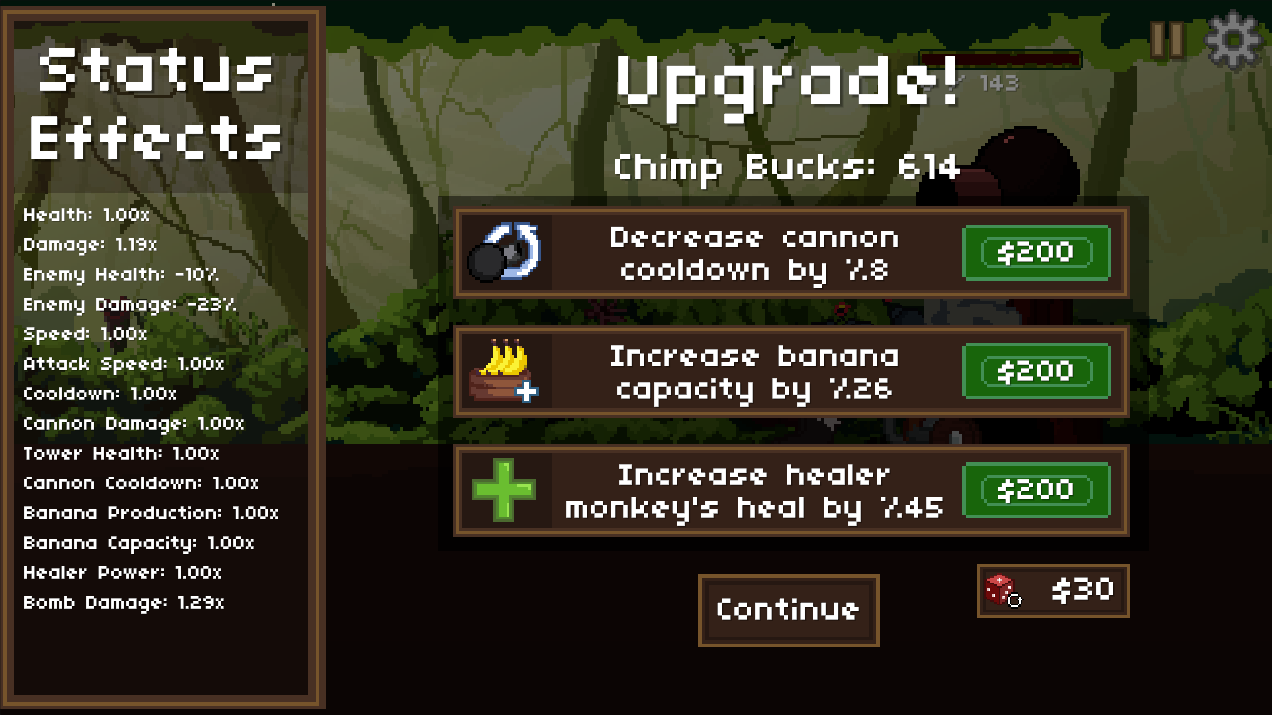 - After beating a level, you will be able to choose upgrades. If you have too many chimp bucks, reroll the upgrades using the button in the bottom right.